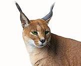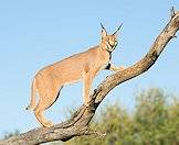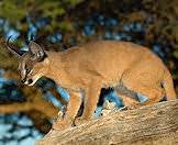 The caracal, or 'rooikat' (red cat) as he is known in Afrikaans, is a relatively small lynx-like creature a bit like North America's bobcat. He is stockier than his close cousin the serval and his fur varies from light red to a rather dark brick red. He is characterized by a rather short tail and prominent, distinct tufts on the ends of his ears.